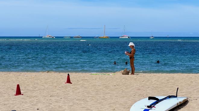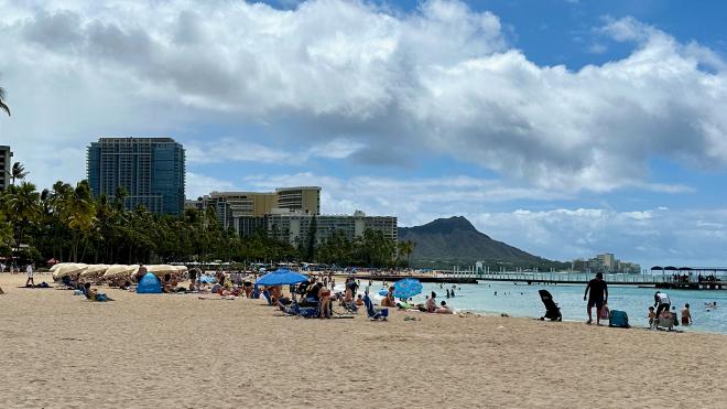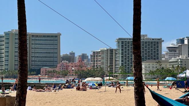 The apartment was a five minute walk from Kahanamoku Beach, which is the end of a string of beaches that run the entire length of Waikiki. This is the view looking down the beach towards Diamond Head, the large hill in the distance.