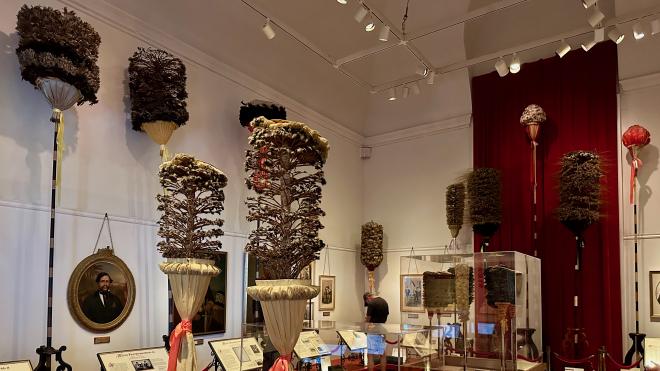 This room told the story of the Hawaiian monarchy, from King Kamehameha I, who first united the Hawaiian Islands in 1810, through Queen Lili‘uokalani, who was forced to abdicate in 1895 following the hostile usurpation of her government in 1893. This led ultimately to annexation of the Islands by the United States in 1898, against the clearly expressed wishes of the Hawaiian people. The large feather plumes are kāhili, used to announce a chief’s presence and also serving as spiritual protection. The Bishop Museum has the world’s largest collection of kāhili.