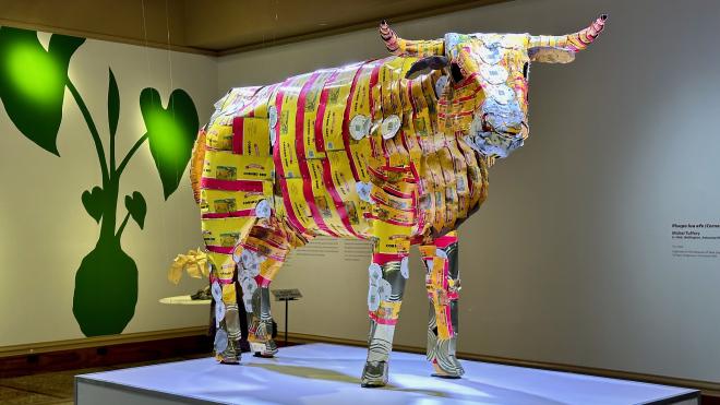 When Europeans began to settle the Hawaiian Islands, they brought foreign foods with them that had a largely negative effect on the diet of the native Hawaiians. One of the most significant was canned meat, part of the subject of an artistic exhibit entitled Corned Beef & Kalo. This sculpture, Pisupo lua afe (Corned beef 2000) by Michel Tuffery, is made entirely from corned beef tins.