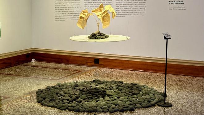 This is kalo, also known as taro, as represented in the sculpture KALO by Bernice Akamine. The plant’s leaves are reproductions of pages from the Palapala Hoopii Kue Hoohuiaina, the petitions against annexation, from 1898. At the time there were approximately 40,000 Hawaiians; the petitions included 38,000 signatures. The stones represent Hawai‘i’s origin stones of legend. Kalo was the staple of the Hawaiian diet before European contact; its root is mashed to make poi paste.