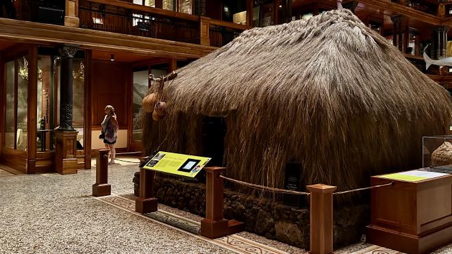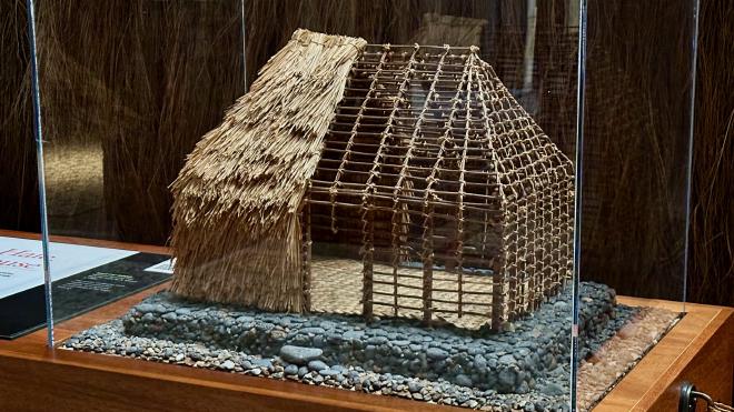 This cutaway model shows the interior construction of the hale pili. The frame is made from the dense native wood uhiuhi, lashed together with cordage of ‘uki‘uki.
