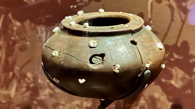 The Museum had a large display of carved wooden bowls. This one, intended to be used as a spittoon, is decorated with human teeth.