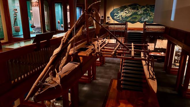 In the adjacent Polynesian history section of the Museum, this Fijian fishing canoe or vaqa is suspended from the ceiling. Before being purchased by the Museum in 1985, this was used for many years by a family on Fulunga Island.