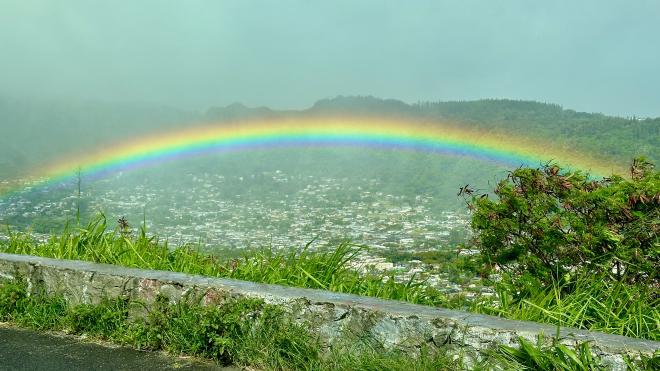 We were picked up in a shuttle provided by the luau. In Waikiki it was sunny, but we could see clouds over the mountains inland. As we climbed the hillside we were soon in rain. We stopped briefly at a lookout over the Manoa Valley, where we were treated to this spectacular rainbow.