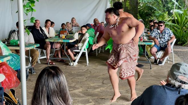 Before dinner we were entertained with dances from around the Polynesian Triangle. Normally these would have been presented in a small outdoor amphitheatre, just down the hill, but because of the intermittent rain everything was moved into the main dining tent.