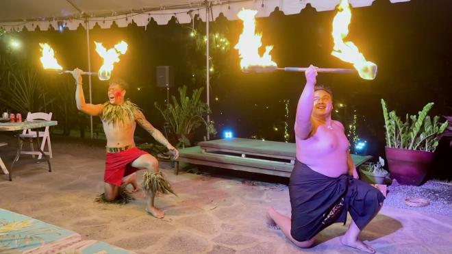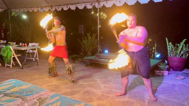 … followed by fire knife spinning. Spinning the Polynesian hooked knife has been a demonstration of martial prowess for centuries. Fire was added in Tahiti in about 1948 and has since spread throughout Polynesia.