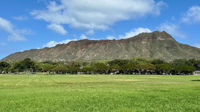 At the far end of Waikiki is Diamond Head, the remains of a volcanic crater. This is the view from Kapi‘olani Park.