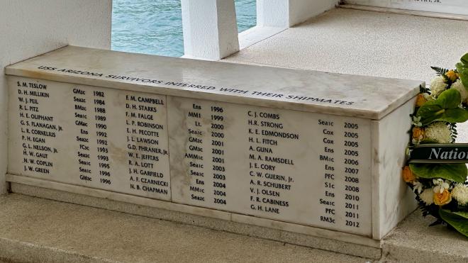 Flanking the names of those who perished in the attack are the names of those survivors who chose to have their cremated ashes interred with their shipmates. The last survivor of the USS Arizona passed away at 102 years of age, the week before our visit. He chose to be buried beside his wife in California, so there will be no further interments.