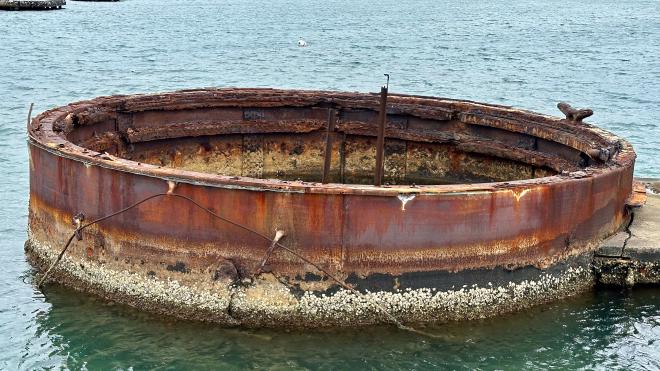 The remains of gun turret 3 extend above the water line. The white buoy marks the bow of the USS Arizona.