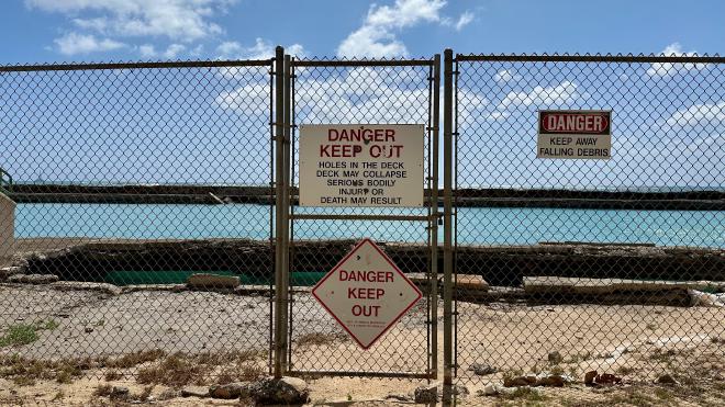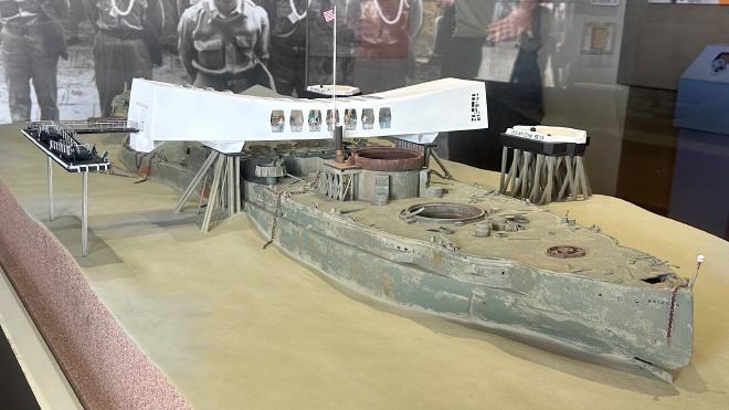 This is a model of the USS Arizona Memorial, back on the shore, which helps to understand its construction. The Arizona’s armament store exploded during the Japanese attack on Pearl Harbour on 7 December 1941. The ship immediately sank, with the loss of 1177 sailors and marines aboard. Over 900 of the bodies were never recovered, so the ship itself is a military cemetery. The Memorial, dedicated in 1962, is constructed as a bridge across the sunken hull.