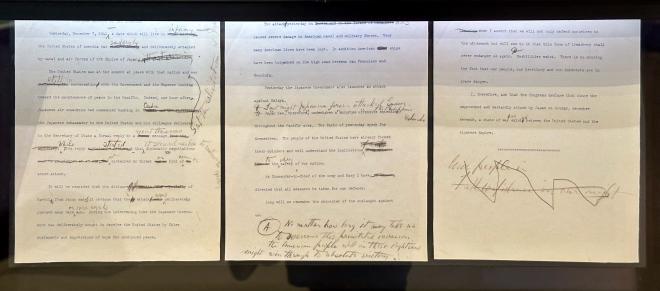 Back ashore we visited the rest of the Pearl Harbour National Memorial. It includes a large exhibit of the lead up to the attack, the attack itself, and its aftermath. This is the “Day of Infamy” speech that President Roosevelt read before Congress the day after the attack, seeking a formal declaration of war against the Japanese Empire.