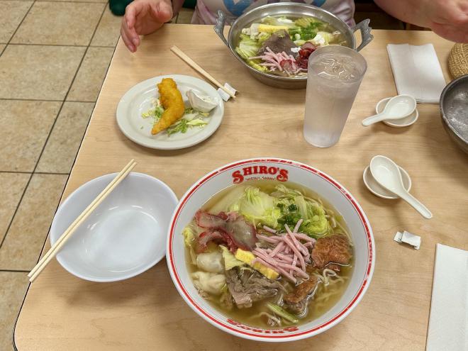 From the Memorial we hopped another bus that took us further east to Aiea and Shiro’s Saimin Haven. This was a recommendation of Greg’s friend Eric Shibuya, another Honolulu native and the only person we know aside from Greg who’s both a serious juggler and a professor at a military university. Saimin is a particularly Hawaiian take on the ubiquitous east Asian noodle soup, and Shiro’s is claimed to be one of the best places to eat it. We weren’t disappointed! Eric also recommended Young’s Fish Market and the Rainbow Drive In, none of which we were able to visit.