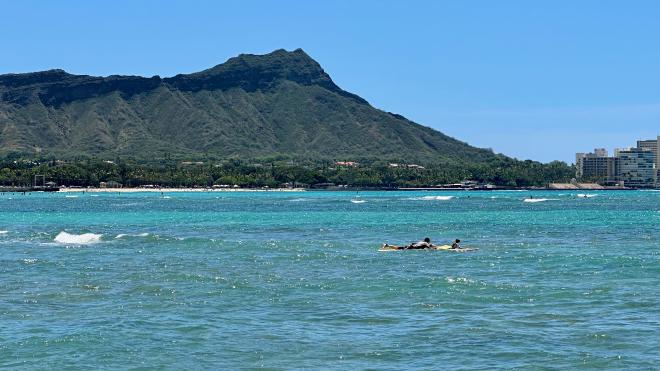 Down towards Diamond Head there were quite a few surfers in the water, including at least one surf school.