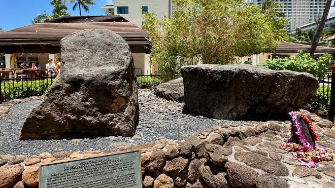 These stones are the living legacy of four Tahitian healers “known for duality of male and female spirit and their wondrous works of healing” who visited O‘ahu from Raiatea in the 1400s. The stones were quarried on their departure from the island and placed two each at their residence and their favourite swimming place by the sea, with great ceremony. In 1997 the stones were moved to a specially-constructed altar near Waikiki Beach, where they were joined by a fifth stone quarried on Raiatea and brought to O‘ahu.
