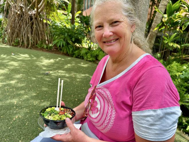We picked up lunch from Poke Fix, a hole-in-the wall place one block off the main street that’s reputed to have the best poke in Waikiki. On Rick’s recommendation, we both had the spicy ahi (tuna) which was outstanding. We ate in a quiet garden just off the main street.