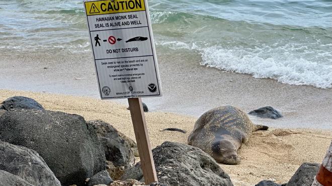 We wandered back to Kahanamoku Beach, where we found a spot to sit in the shade. This Hawaiian Monk Seal was napping on the beach. Initially it was surrounded by traffic cones; while we were sitting a “marine mammal protection” volunteer showed up and planted warning signs around it.