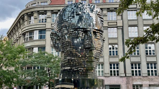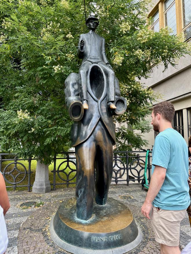 From the Old Town Square we headed north towards the Jewish Quarter. Right on the edge of the quarter is another statue of Franz Kafka, this one by Jaroslav Róna and installed in 2003. It’s based on Kafka’s 1912 story Description of a Struggle and the upper figure is Kafka. Greg has read a bunch of Kafka’s works over the years and agrees with our guide Jan that it’s some of the most surreal and depressing literature you can find.