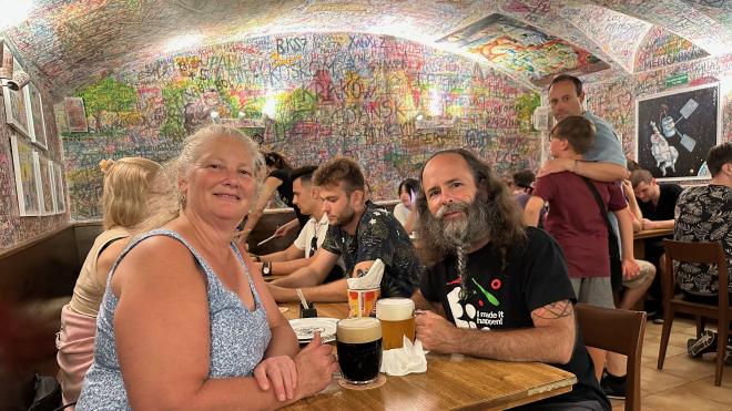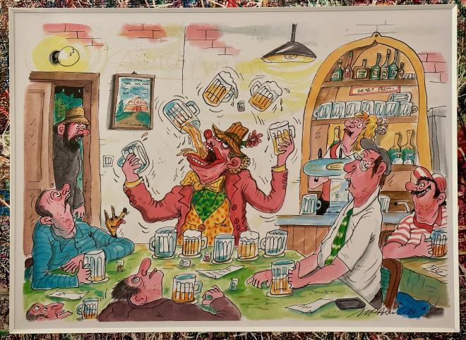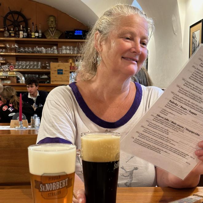This picture of a beer juggler was just behind Karen’s seat. If you look at the previous photograph you’ll see the frames of many other cartoons by artist Petr Urban, all commissioned by the restaurant. But of course this was our favourite.