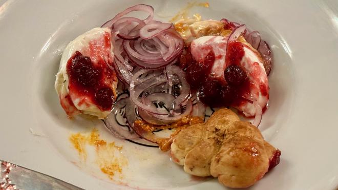 Our appetizer: pickled Brie, which is apparently a common thing in Czech bars just like pickled eggs in the UK. It’s not usually presented quite this fancy. The taste was a bit unusual (pickled cheese, really?) but actually quite good.