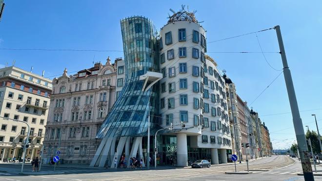 Our actual destination on this part of the walk was a more recent building, The Dancing House. It was designed by Vlado Milunić in cooperation with Frank Gehry. Gehry originally called it Fred and Ginger, but later decided it was inappropriate to import American “kitsch” to Czechia.