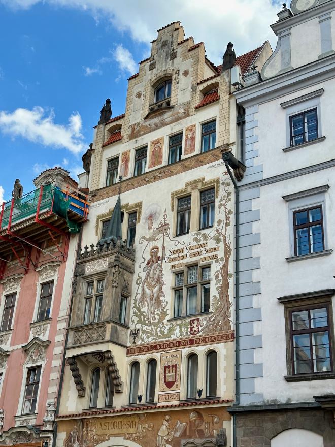Štorchův dům (Štorch’s House) is just on the edge of the Old Town Square. Although it looks medieval, it was actually constructed in 1897. Formerly a bookstore, it now houses a Thai Massage Parlour. It was partially burned in the Prague Uprising, later restored. The painting is of Wenceslaus I, Duke of Bohemia, better known as Saint Wenceslaus or Good King Wenceslas.