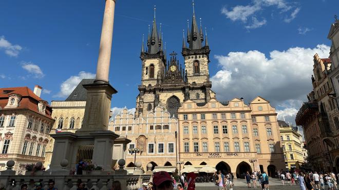 Our tour took us once again to the Old Town Square. The church you can see is Kostel Matky Boží před Týnem, the Church of Mother of God before Týn, built mostly in the 14th and 15th centuries on the site of two previous churches. The front and sides of the church are completely enclosed by buildings, so it’s actually entered through the pointed arch third from the left on this photograph, which is home to an Italian restaurant.