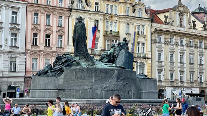One of the main features of the Square is the massive Jan Hus Memorial. Jan Hus, born in 1369, was Czech theologian, philosopher and religious reformer who advanced many of the ideas that ultimately led to Protestantism, about 100 years before Martin Luther. The statue memorializes the Hussites and Protestants who were forced into exile during the Thirty Years War. It was completed in 1915, the 500th anniversary of Hus’s burning at the stake.