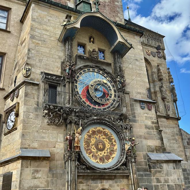 Our tour was timed to include the striking of the hour at Pražský orloj, the Prague Astronomical Clock. Initially constructed in 1410, it’s the oldest astronomical clock still in operation. Our guide warned us that despite the clock’s fame, its hourly striking is “the second most disappointing show in all Europe”. We’re not sure we’d go that far, and hey, what do you want for free? The clock displays a mind-boggling range of information on its two faces, all of which is very well described in the clock’s Wikipedia page.