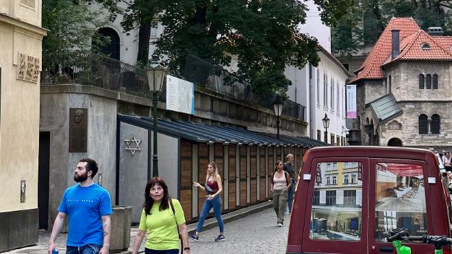 Around the corner is the Starý židovský hřbitov, the Old Jewish Cemetery, used from at least 1439 through 1786. The cemetery is quite small and Jewish tradition does not permit old graves to be dug up. The solution was to layer new graves over old ones, resulting in as many as twelve layers in some places and raising the current ground level about three metres higher than its surroundings. Most of the grave stones were raised up as new layers were added, giving it the crowding you can just see here, above the Star of David on the wall.