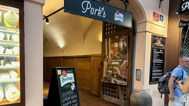 One thing we learned in Pork’s is that there are three recognized “pours” of Pilsner Urquell, each of which (allegedly) has a different taste. We went with the Hladinka, or standard, pour, which gives you the most beer for your money and “pairs well with rich food”, which is certainly what we were having.