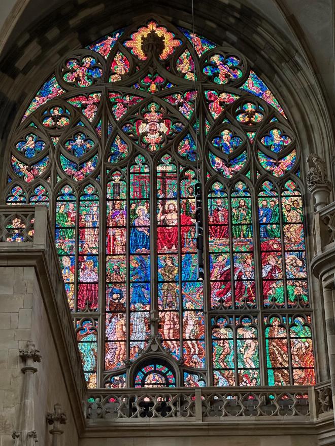 The Cathedral was constructed over an earlier rotunda, built in 930 CE by Wenceslaus I, Duke of Bohemia, better known as Good King Wenceslas, to house the arm of Saint Vitus, a holy relic. Construction of the current Cathedral was started in 1344 CE, and wasn’t finished until almost six hundred years later, in 1929. This imposing mosaic of the Last Judgement is on the courtyard side.