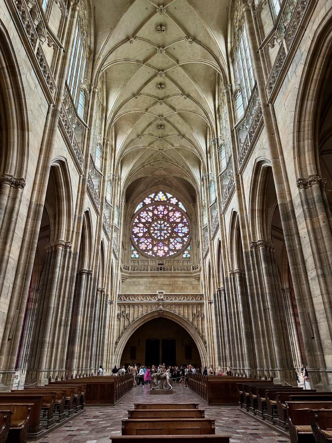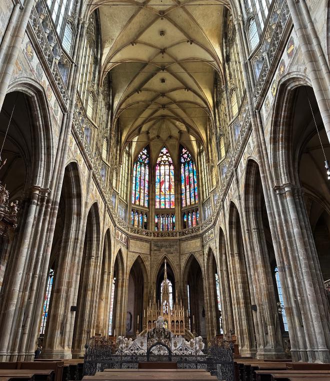 The largest and most imposing building in the castle complex is Metropolitní katedrála svatého Víta, Václava a Vojtěcha, The Metropolitan Cathedral of Saints Vitus, Wenceslaus and Adalbert, better known as St. Vitus Cathedral.