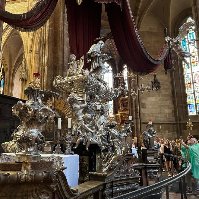 One of the most spectacular pieces in the Cathdral (certainly the gaudiest) is the tomb of Saint John of Nepomuk, constructed in 1736, 1746 and 1771 mainly at the direction of Marie Theresa, Queen of Bohemia.