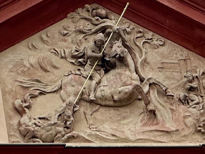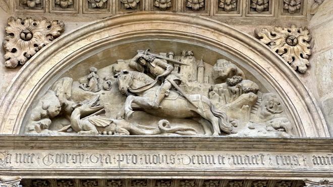 The exterior features two reliefs of Saint George slaying the dragon, this one on the western facade…