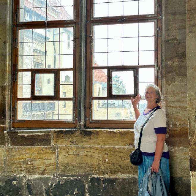 Also in the Palace is this window, notorious for being the site of the 1618 Defenestration of Prague, part of a sequence of events that led to the Thirty Years’ War. No one was defenestrated during our visit.