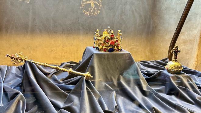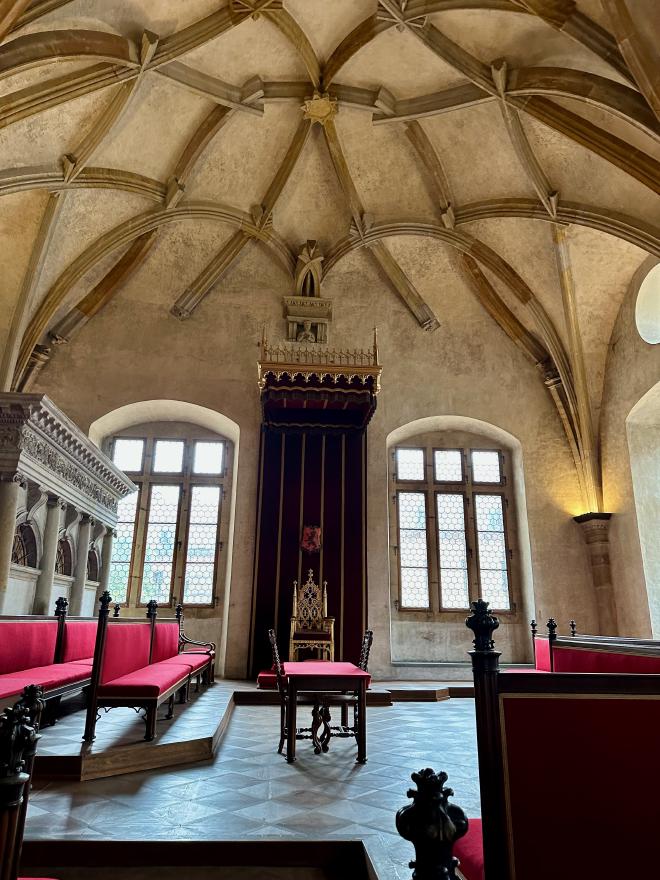 The throne room houses replicas of the Bohemian Crown Jewels. The real ones are stored in a secure facility in St Vitus Cathedral. The crown was made for the coronation of Charles IV in 1347.