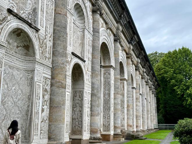 This is the Prague Castle Ball Game Hall, used for tennis-like ball games in the sixteenth century, then as a riding stables, and then as a military storehouse. The building was burned by the Nazis in 1945 and reconstructed in 1952. It’s currently used as an exhibition hall and for concerts. The decorations on the exterior are called sgraffito, and are made by scraping off a lighter exterior layer of plaster to reveal a darker layer below.