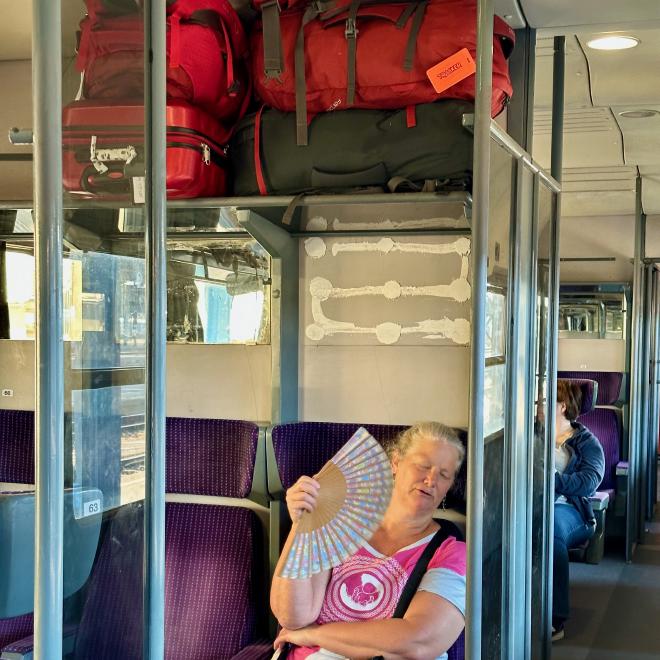 Let’s say this up front: we loved our time in Romania but we hated the Romanian trains. They still haven’t dragged themselves entirely out of the Soviet era and passenger comfort just isn’t a priority. No air conditioning, very narrow seats, little space for luggage, and a lack of basic maintenance were features on both of the Romanian trains we took. You can tell from the look on Karen’s face how much she’s enjoying the ride.
