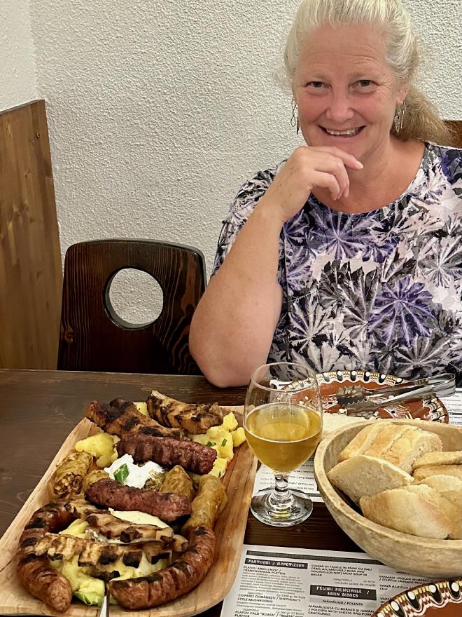 However, the food in Romania was amazing, as long as you don’t mind heavy meat dishes. After checking into our AirBnB, we took our host’s recommendation and headed to Restaurant Roata for a traditional Romanian meal. The menu was extensive and we were having trouble deciding what to order, when we stumbled on this hot platter, billed as a “two person” main meal. Since it included samples of many of the things we were interested in, we decided to give it a go. From the menu: “stuffed cabbage rolls, cabbage à la Cluj, fried homemade sausages, grilled forcemeat, pork ribs, fried bacon, polenta with cheese and pork cracklings, country style potatoes, 1.5 kg.” (Fun fact: Romanian restaurants are required by law to include the weight of each dish they serve.)