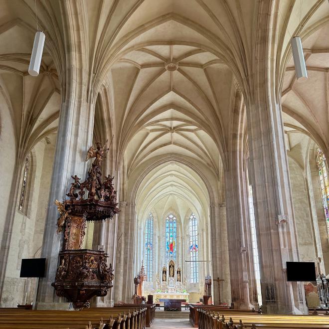 St. Michael’s is extremely plain compared to other Catholic churches of the era. This is a result of its complicated history: originally Catholic, then Lutheran for twenty years, Unitarian for a hundred and fifty, then Catholic again from the counter-reformation in the early 18th century. Its original decorations were removed during the Lutheran and Unitarian eras and never replaced.