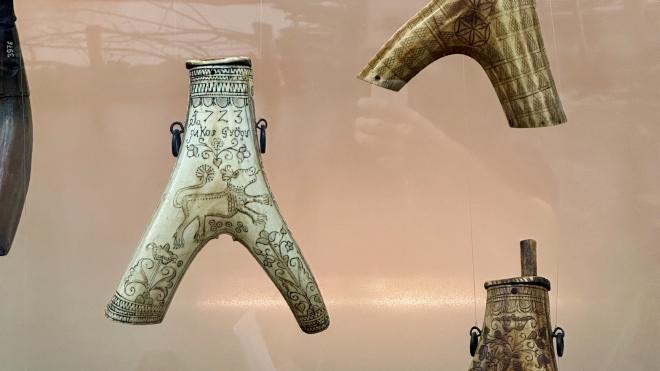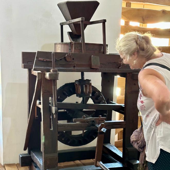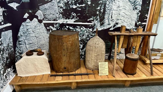 The museum was fascinating, and included a wide range of artifacts from rural occupations of all kinds. This is beekeeping equipment and includes a horn for finding the wild hives, hollow trunk and woven beehives, a wax press, a honey storage container, and a honey comb knife.