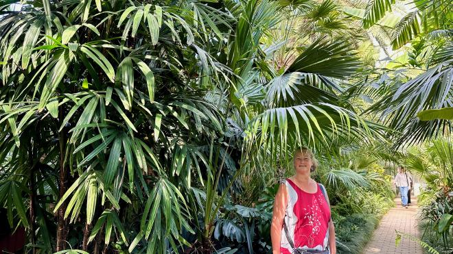 The garden also includes several large greenhouses, such as this one, full of palms and other tropical plants.