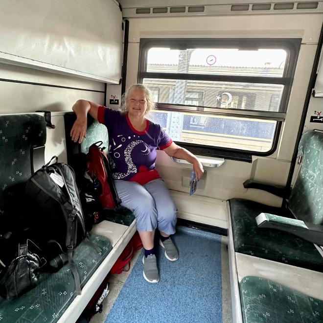 If you leave from Sofia, you can get two-person luxury sleepers, but from Bucharest it’s four-person basic compartments only. Karen is sitting on “our” side of the car. The backrest behind her folds down to make one bed, and the second bed is on the wall above her.