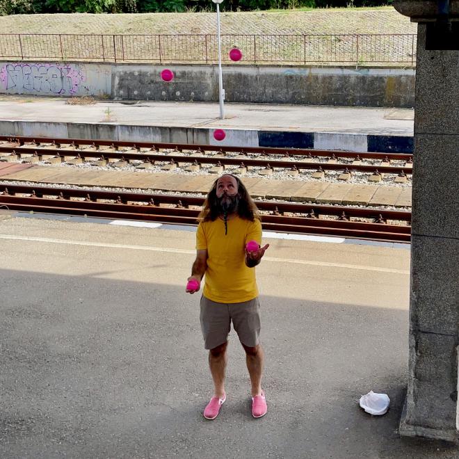 One of our twenty-minute stops for a train change turned into an hour and a half when our connecting train was late. Greg decided to do a little juggling on the platform to pass the time, and ended up teaching a few other passengers to juggle.