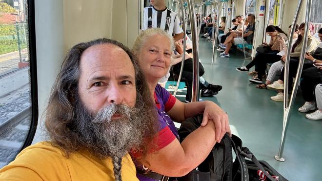 We had to get our passports stamped four times: exiting Romania, entering Bulgaria, exiting Bulgaria, and entering Türkiye. The first three were easy: the border officials came on board, collected our passports, vetted and stamped them, and returned them to the conductor. Getting into Türkiye was a bit more painful: we had to exit the train with all our belongings, have our passports stamped, and then have all our bags x-rayed in the metal shed behind Karen. Meanwhile the border guards went through the entire train searching for contraband. Eventually, after about an hour and a half, we were allowed to re-board and continue on our way. Did I mention we arrived at the border about 1:30 in the morning? Yeah. Fortunately we knew all about this in advance, from reading the excellent write-up by The Man in Seat 61, whose web site is an invaluable resource for anyone travelling by train anywhere in the world.