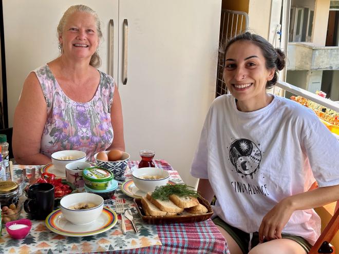 Our host, Funda, met us at the station and we had a leisurely fifteen-minute stroll to her apartment. Funda is a juggler that Greg had been introduced to at the European Juggling Convention by our mutual friend Matty from Vienna, who had lived in Türkiye for a couple of years. On the basis of a three-minute conversation (literally), Funda invited us to stay in her spare bedroom during our time in Istanbul. When we arrived she insisted on making us a typical Turkish breakfast, which we ate on her balcony. As you can probably guess, she’s a lovely, warm, kind person and we had a terrific time staying with her.