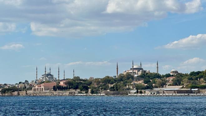 From the ferry we had wonderful views of both shores. The two large mosques you can see here are the Sultan Ahmet Mosque (better known as the Blue Mosque) at left, and Hagia Sophia Grand Mosque. Topkapı Palace is just to the right of Hagia Sofia but not really visible in this photograph.