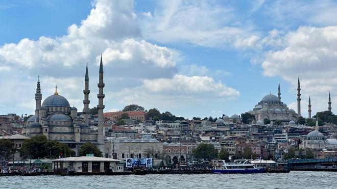 Our ferry went up the Golden Horn, which is a large horn-shaped inlet that separates Karaköy on the north from Eminönü on the south. Our ferry stopped at Karaköy first, before continuing on to Eminönü which is where Topkapı Palace is found. This is the view looking south across the Horn. The two large mosques you see are Yeni Cami (left) and Rüstem Paşa Camii.