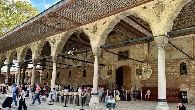 Topkapı Palace is an enormous, Ottoman-era complex with four major courtyards. This is a view from the southernmost courtyard, looking back towards the visitor entrance. Construction of the palace, under Sultan Mehmed the Conqueror, began in 1459 and the palace was essentially complete by 1465, though many expansions and modifications were made in subsequent centuries, particularly between 1520 and 1560 under Suleyman the Magnificent. The palace opened as a museum in 1924.