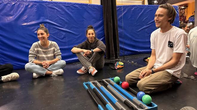 … and then hopped a bus to meet Funda at a studio near her apartment where Craig Quat (right) was giving a seminar. This was another lovely coincidence: Greg and Craig have known each other since 2016, when they met at a juggling convention in Pennsylvania. Craig is the inventor of the Harmonic Juggling visualization, and Greg developed software to draw it in collaboration with him then had the visualization of 77862 (the Why Not? passing pattern) tattooed on his left arm. The last time we connected in person was also a fun coincidence: in early 2017 we overlapped in Belfast for one day – Craig arriving to teach a seminar, us about to leave from a couple of days’ sightseeing with Jared – and Greg and Craig spent an evening wandering the city and talking about juggling. For many years Craig’s primary focus has been on Functional Juggling, which is largely about juggling as a physical, mental, and occupational therapy technique. In front of Craig is the Juggle Board, one of many styles of apparatus he’s designed to support this work. You can buy pre-made versions of the Juggle Board, and Craig has published open source instructions and 3D printer files to make your own. He has also published a freely-available book on Functional Juggling in English, Spanish, Italian and Greek (so far) with support from many organizations including the EU’s Erasmus+ program. Since about 2017 Craig has been living and working in South America; currently he’s on a tour of Europe teaching Functional Juggling and was in Istanbul for just a few days, with just the one seminar. We hadn’t told Craig we were in town; the look on his face when we walked into the studio was priceless.